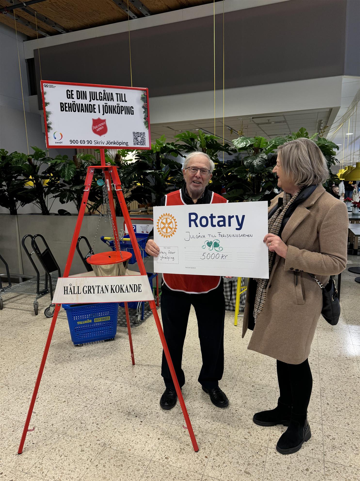 | Insamling till Frälsningsarmén. Jönköping Öster Rotary klubb har skänkt en gåva till Frälsningsarméns i Södra Vätterbygdens julinsamling. Frälsningsarmén i Södra Vätterbygden genomför årligen insamlingar till förmån för att ingen skall känna sig utanför i jul utan att alla ska känna glädje och gemenskap. Det känns bra att vår klubb också kan bidra till att dessa familjer skall få upp leva en god jul. Vi vill önska er en riktigt god jul och ett gott nytt år - med tid för vila, skratt och sådant som betyder lite extra för var och en. Nu blickar vi framåt mot 2026! Vi startar upp luncherna den 16 januari. |